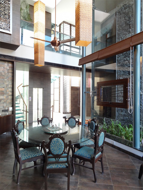 A small intrusion is made in the plan, where the living area and the dining space is separated by a green volume of plantation. This not only provides a beautiful backdrop for the antique dining furniture, but also provides a calming natural view and ventilation for the spaces around. Being a double height, this dining space is the centre of the house and provides natural light to the entire house throughout the day.