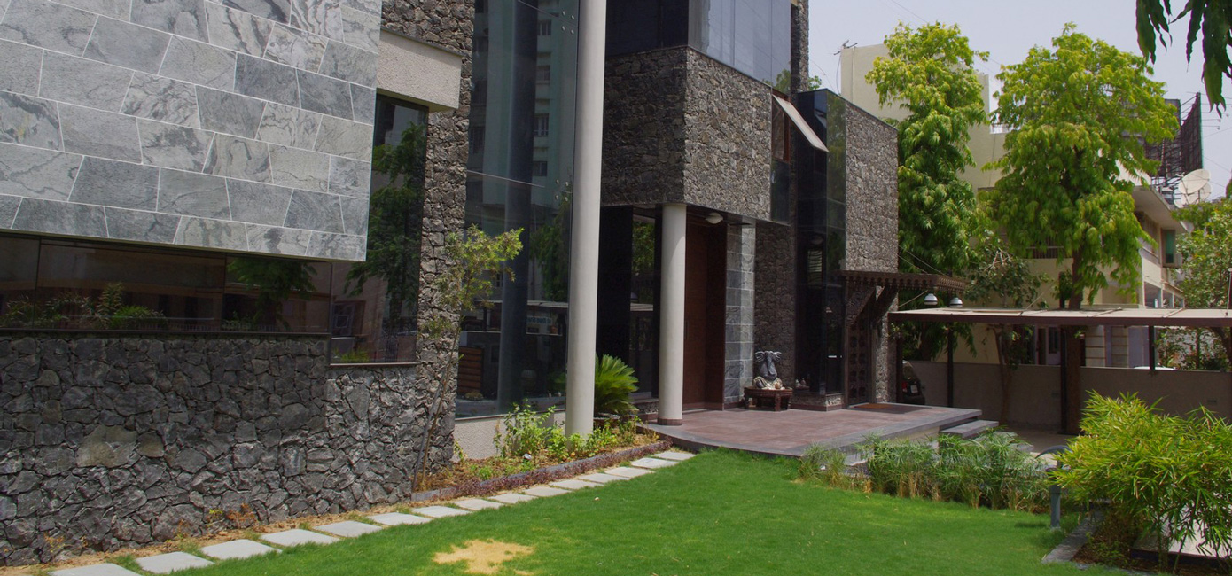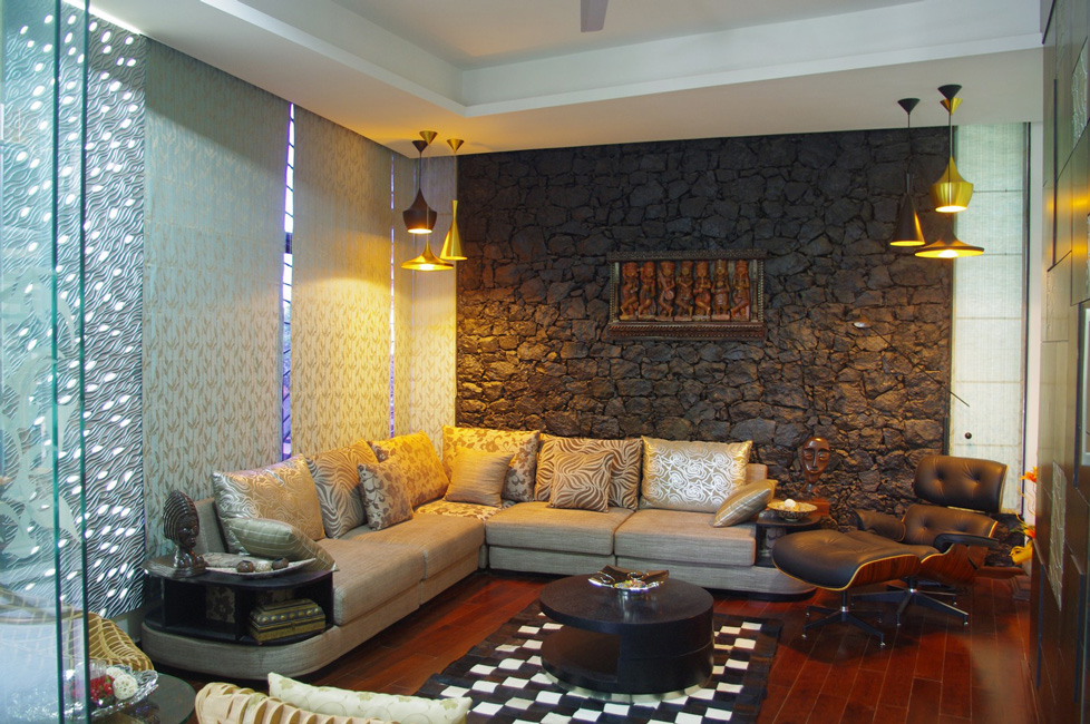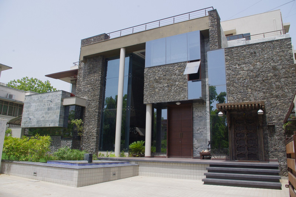 A conscious choice of using grey stone masonry for the walls was to blend the traditional elements in a contemporary space. The main door is an antique salvaged from a traditional haveli set in this grey stone masonry wall. The space for each piece of art is carefully created in a way that it highlights rather than cause an intrusion.