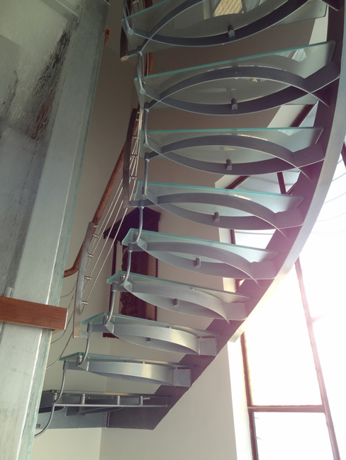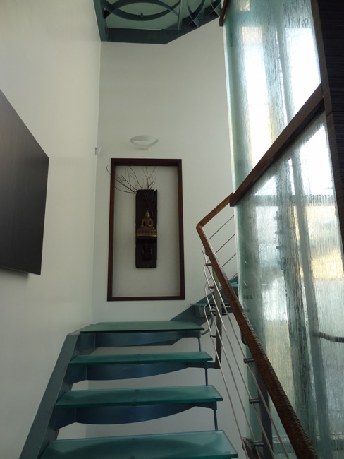 The glass staircase running from basement to second floor has a backdrop of mother of pearl panels that glows during the day and provides light for circulation.
