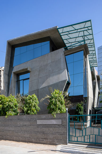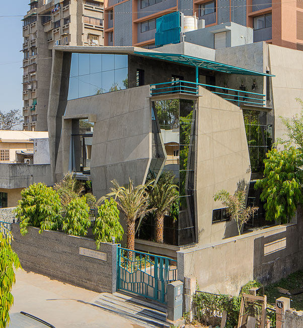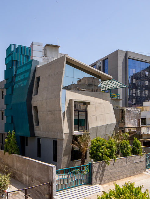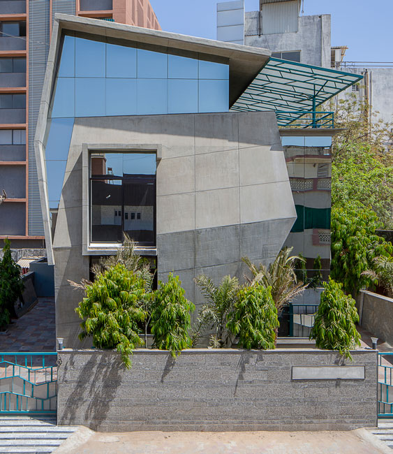 Set in a dense urban neighbourhood, this is a small five bedroom residence situated in a quiet street of Ahmedabad. Privacy and natural light became a main concern when designing on plot with neighbouring houses so nearby. Each external surface of the house was made either opaque to provide privacy or transparent to permit natural light. Several cardboard models were made to understand these surfaces. Folds and half cuts of the cardboard became the exposed reinforced concrete surfaces, whereas the gap and punctures in between was where the natural light was allowed inside.