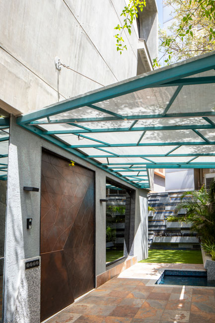 The front side of this house was the face that didn’t interfere into a neighbour’s view, this side faced south. And this was where maximum heat would enter the house. Thus the sun path was studied to understand the light penetrating inside the house during the day. This sun path determined where the exposed reinforced concrete surface was to be placed so that selective light would enter the house.
