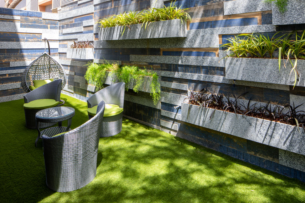 During the day the morning sunlight fills up the living room and the foyer, while around noon the patio sitting outside the dining would be flooded so that the dining room would be brightly lit during lunch time. The waterfall outside the dining provides a soothing view of water cascading down in the brightly lit noon light.