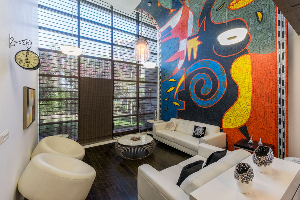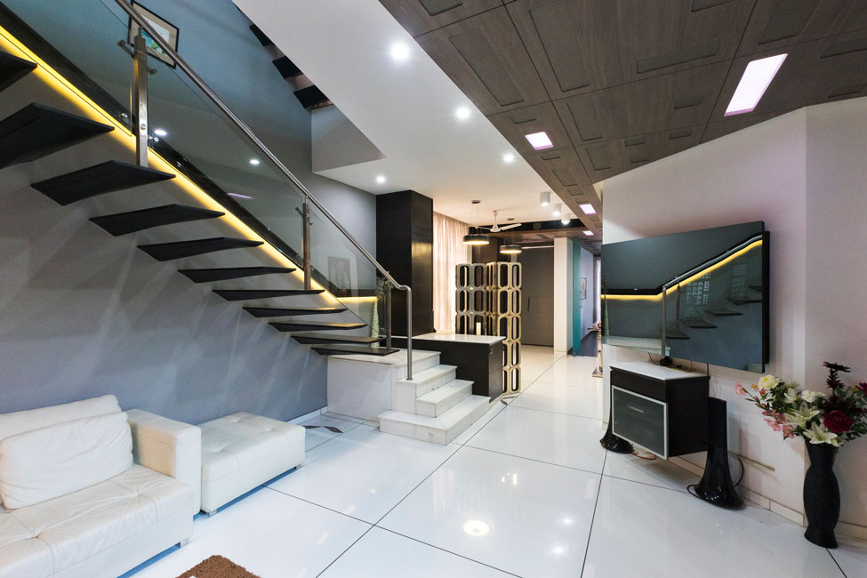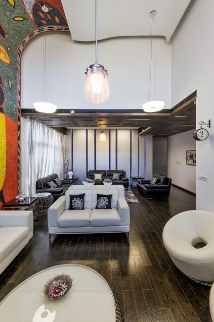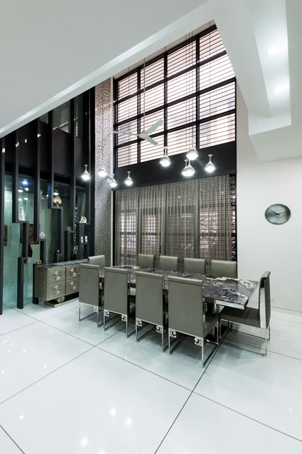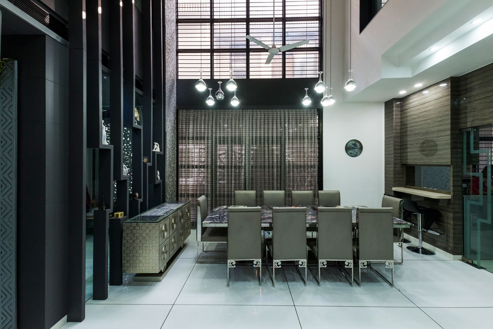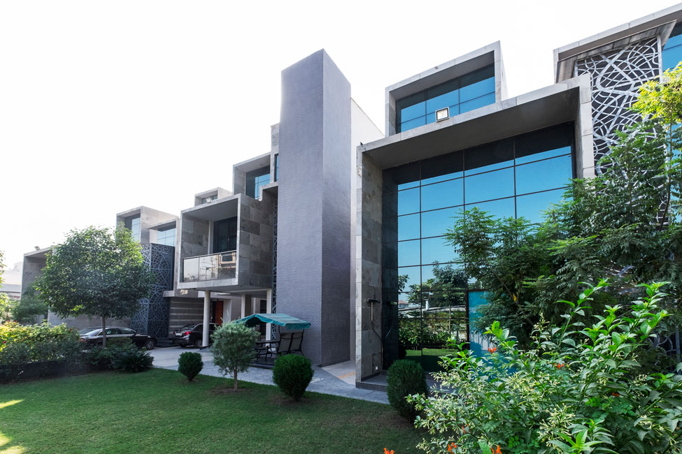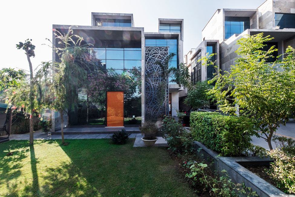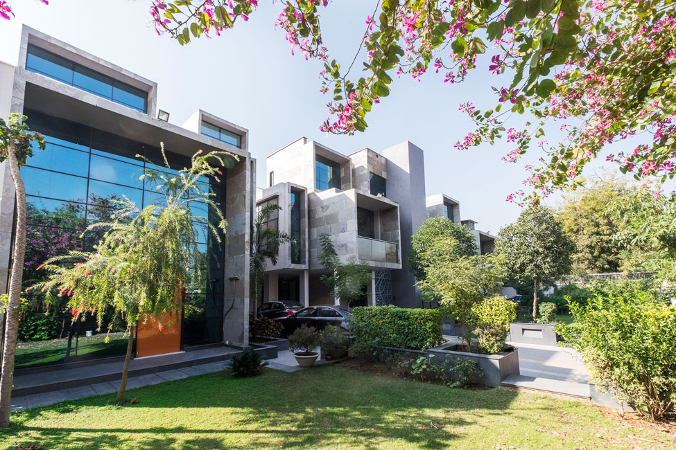 The external face of the cube was made of glass permitting the soft northern light throughout the day. Moreover this assembly of cubes was broken by inserting a softer element of an organically designed grill. The time honoured Indian principles of vastu shashtra were kept in mind while creating the layout of each individual house. Hence the three residences were placed length wise parallel to each other on the long plot of land. This resulted in strips of long open spaces in between each house and a large garden area in the front for common use. These long open spaces in between were landscaped to provide privacy to each residence as well as it became a source of light and ventilation. The interior spaces of the residences are fundamentally double and single height volumes locked up into each other. The circulation of each of these houses is essentially linear creating pockets of spaces on either side.
